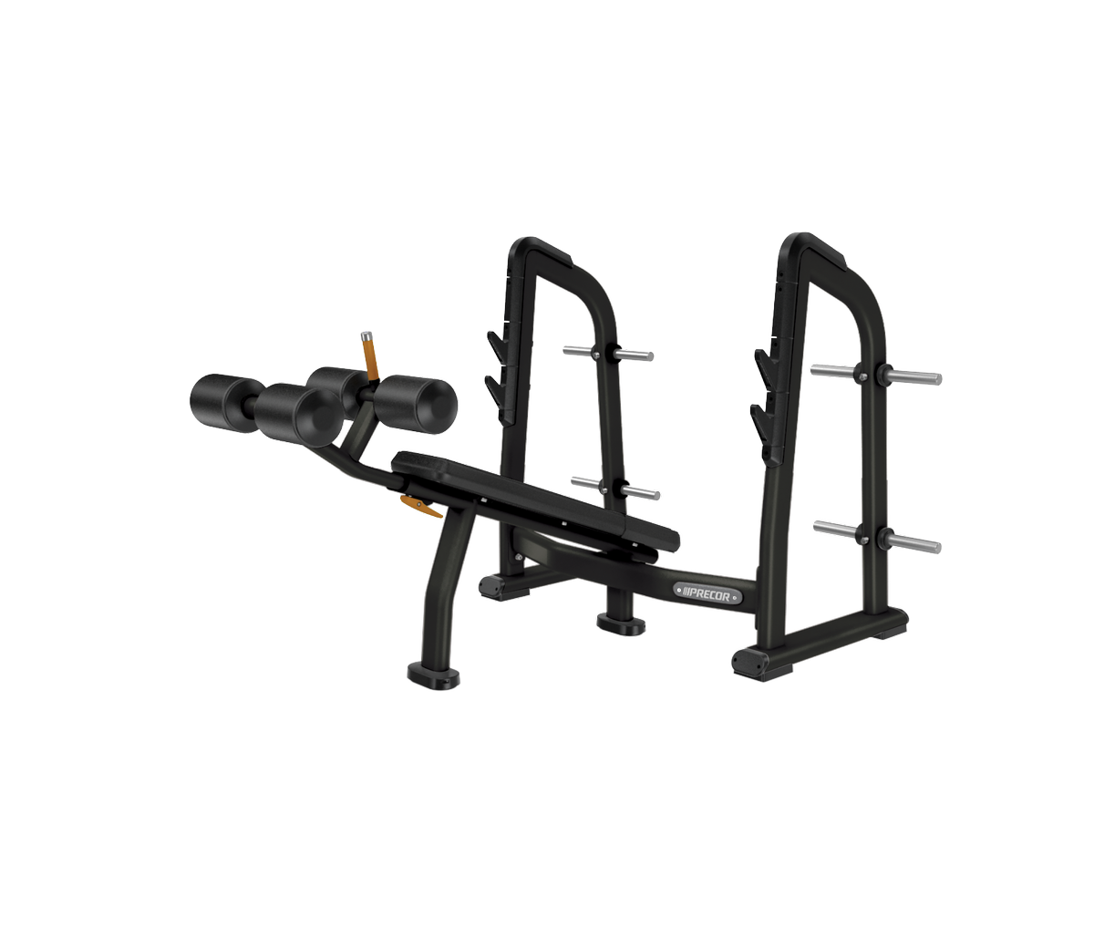 - Sujeción de pie mediante rodillos almohadillados: La sujeción de pie mediante rodillos almohadillados ajustable permite la colocación ergonómica de los usuarios para la ejecución de movimientos de prensa declinada sin una rotación externa excesiva de los hombros.