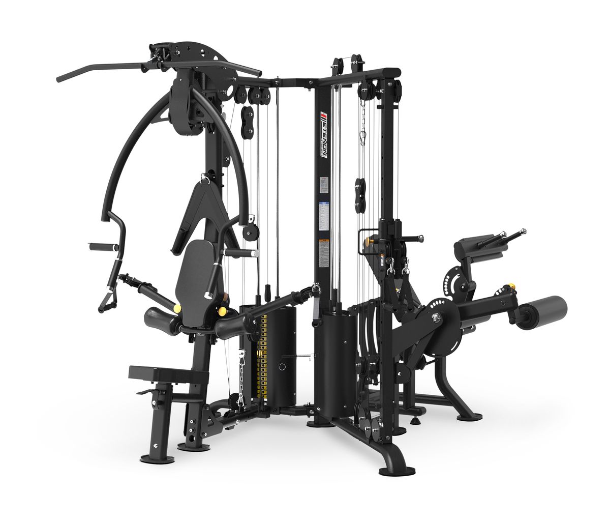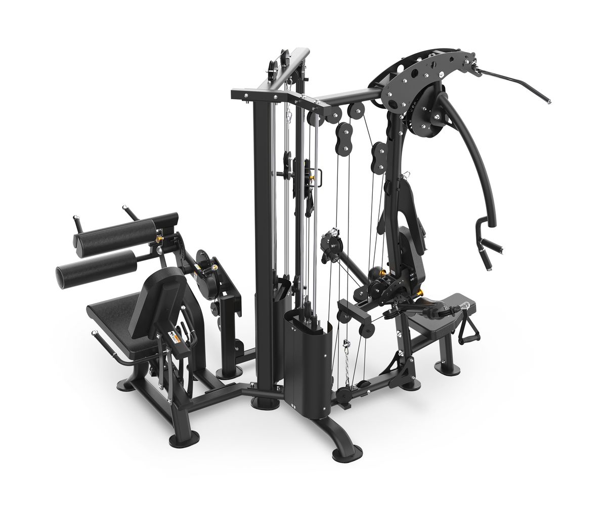 Elle comprend une station pour un entraînement complet des pectoraux, du dos/dorsaux et des abdominaux. À côté, il y a une double poulie réglable avec des prises individuelles, idéale pour les exercices fonctionnels et d’isolation. Enfin, elle inclut une station spécifique pour travailler les quadriceps et les ischio-jambiers, permettant un développement équilibré du bas du corps.